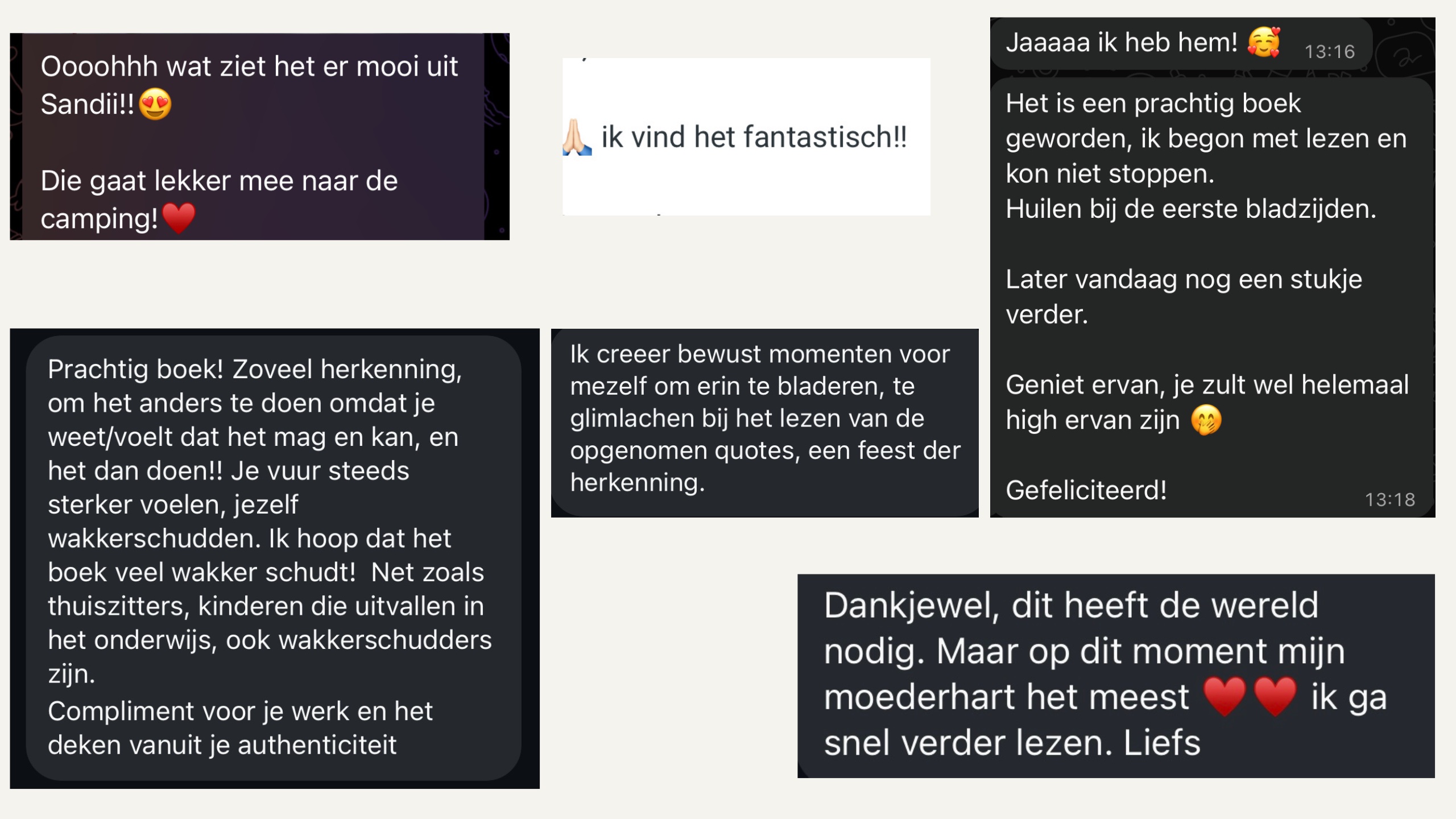 Ondertussen verlegde Sandii haar energie naar het helpen van ondernemers om hun bedrijf werkelijk in te zetten als middel naar een vrijer leven. Dat kan namelijk. En dat deed ze zelf ook (daarom kon dat ook gemakkelijk gelijktijdig). Ze woont als zelfbenoemde nepboerin met meneer en 3 kinderen in een boerderij met stukje grond waarbij ze veel tijd voor elkaar hebben.